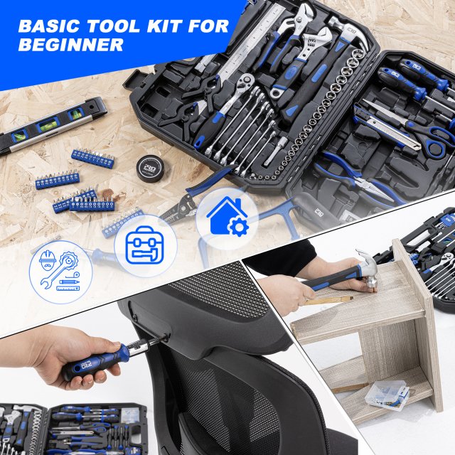This tool kit includes a wide selection of professional-grade essentials: ratchet wrenches, magnetic levels, 1/4-inch and 3/8-inch metric sockets, precision screwdrivers, hammer, tape measure, pliers, and more. The 72-tooth ratchet lets you switch directions smoothly with just a 5-degree turn, making it perfect for tight spaces. Plus, the included screwdriver bits cover Phillips, slotted, square, star, and Pozidriv for maximum versatility.