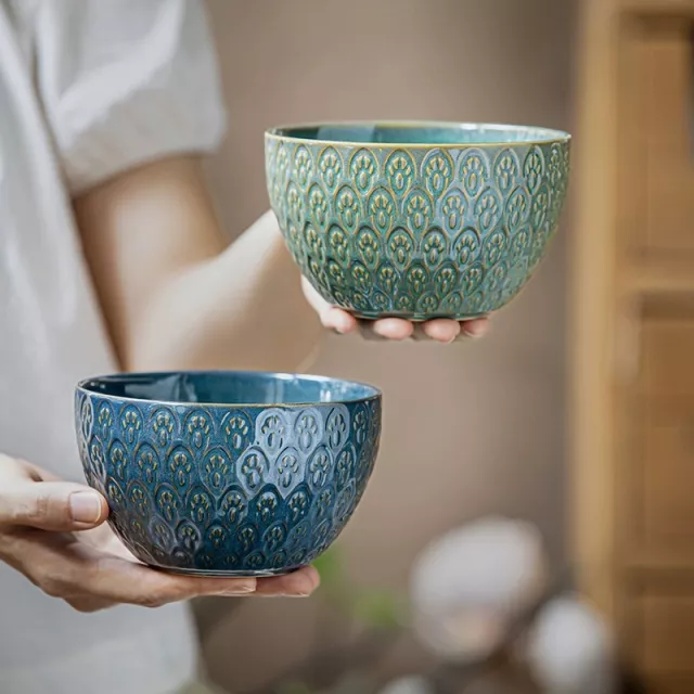 Perfectly sized at 5 inches, these ceramic rice bowls are ideal for serving rice, soups, or small dishes. The deep relief pattern adds texture and visual appeal, making each bowl a true masterpiece. The kiln change finish ensures that no two bowls are exactly alike, giving your table a unique and sophisticated look every time you use them. The durable ceramic construction promises long-lasting use, while the smooth interior makes cleaning effortless.