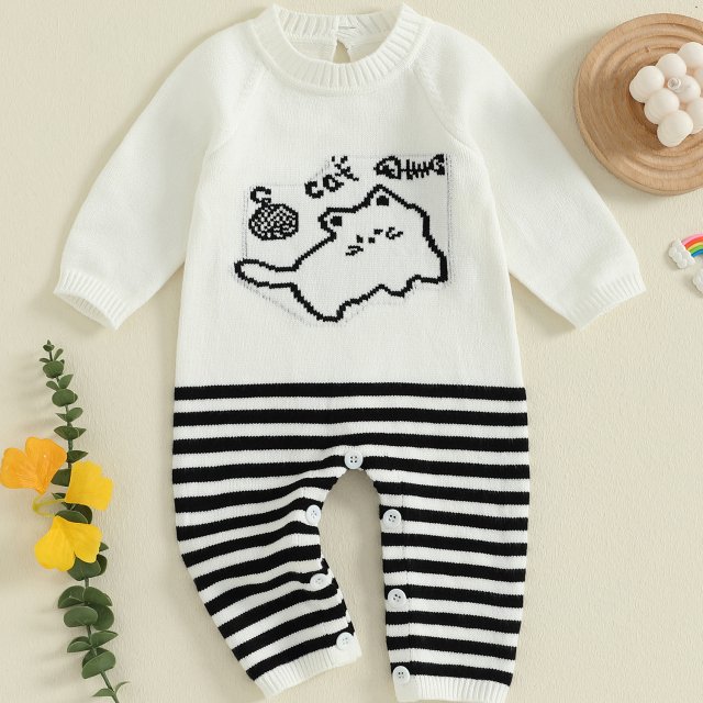 Autumn Baby Jumpsuit Long Sleeve Cat Print Knit Romper Outfit