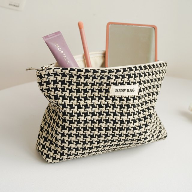 This cosmetic bag is thoughtfully crafted to be both stylish and practical. Measuring approximately 2 inches wide, it offers enough space to store daily essentials without being bulky. The houndstooth pattern adds a touch of sophistication, while the lightweight yet sturdy construction ensures it can handle travel and everyday use with ease.