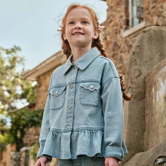 This girls’ spring denim jacket is designed to bring charm, comfort, and confidence to everyday outfits. With its clean look and playful printed details, it adds just the right touch of fun while staying easy to wear. Soft cotton fabric with a hint of stretch makes it gentle on the skin and comfortable for active days. The classic turn-down collar and full-length sleeves create a timeless silhouette that works beautifully for school, family outings, and special moments.