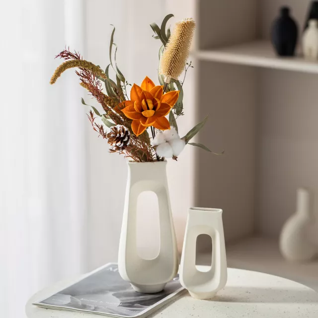 Elevate the ambiance of any room with the Nordic Abstract Matte Ceramic Hollow Vase. Designed with clean lines and a minimalist aesthetic, this vase is a stunning work of art that adds sophistication and style to your decor. Its abstract hollow-out shape creates a striking visual impact, making it the perfect centerpiece for any table, shelf, or mantel. With a tactile matte finish that invites touch, this vase becomes more than just a functional item—it’s a statement piece that completes your modern home decor.