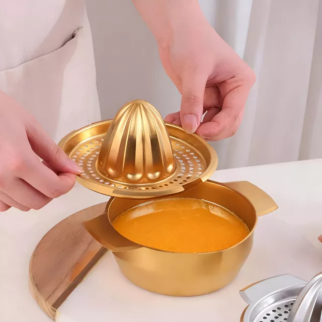 Bring the taste of fresh-squeezed juice to your table with this Gold Stainless Steel Citrus Juicer. Designed for convenience, durability, and elegance, this manual juicer lets you extract every drop of juice from lemons, oranges, and other citrus fruits with ease. Its sleek gold finish adds a touch of sophistication to your kitchen while delivering unmatched performance.