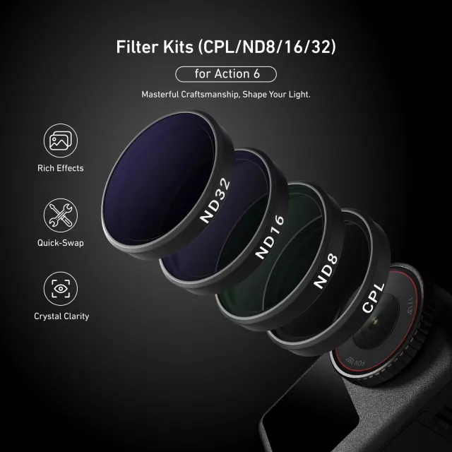 Don’t settle for ordinary footage. Upgrade your shooting experience with this essential filter kit for your DJI OSMO Action 6. Get the creative freedom and protection you need, all in one kit. Perfect for professionals and enthusiasts alike, this filter set allows you to enhance every shot with precision and clarity. Order now and start capturing breathtaking footage!