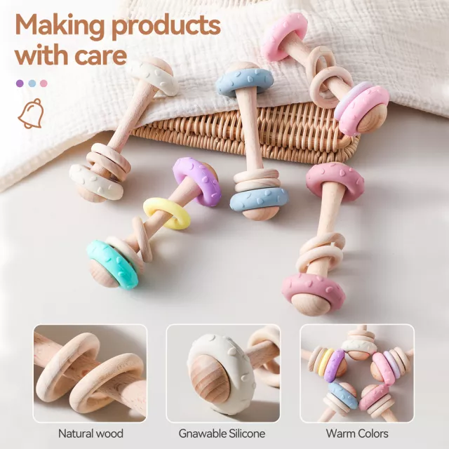 Inspired by Montessori principles, this toy helps babies learn through touch, sound, and movement. The smooth wooden surface and flexible silicone ring offer a satisfying chewing experience while being gentle on delicate gums.